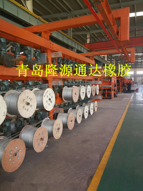 隆源橡膠生產(chǎn)鋼絲繩輸送帶已有多年歷史,積累了一定的生產(chǎn)經(jīng)驗。輸送帶的鋼絲繩型生產(chǎn)線(xiàn)大致有2種類(lèi)型,一種是平板硫化機固定的,帶坯逐段成型逐段硫化,帶坯內的鋼絲繩張力每 硫化一段擇放一次。另一種類(lèi)型是平扳硫化機 安裝在一臺小車(chē)上.小車(chē)可沿軌道移動(dòng),一次成型相當長(cháng)度的帶坯,然后分段硫化,茌分段硫化過(guò)程中,鋼絲繩張力并不釋放,一直到成型好的帶坯完全硫化完畢才釋放鋼絲繩張力。 接著(zhù),平板硫化機及成型小車(chē)退回到起始工作位置,再次成型。周而復始地進(jìn)行上述過(guò)程。
